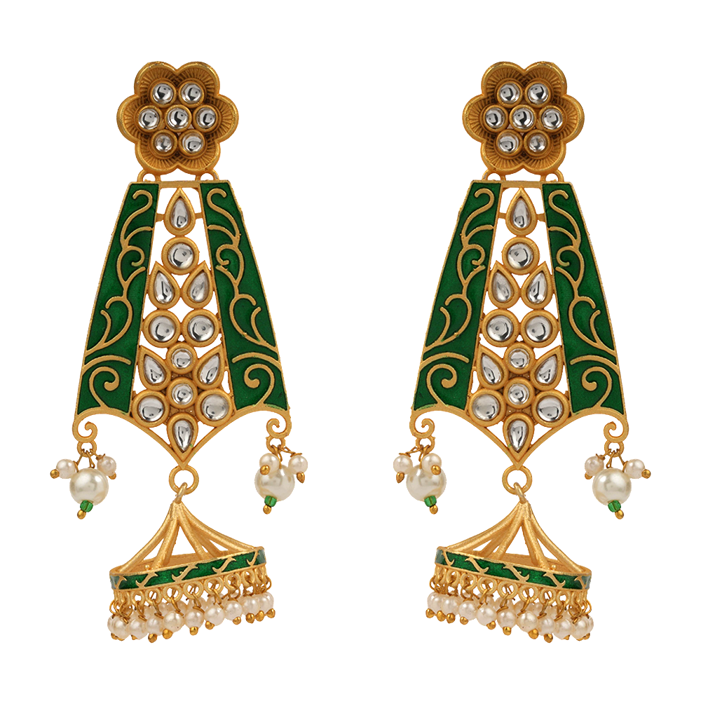 Nirvi stone-studded danglers combine delicate craftsmanship with contemporary elegance. Each earring features carefully selected stones set in a studded design that catches light beautifully, creating subtle sparkle with every movement. The dangler silhouette elongates the face while remaining lightweight for all-day comfort. Perfect for both everyday wear and special occasions, these earrings transition seamlessly from casual to formal settings. The Green tone adds a soft, sophisticated touch to any complexion and pairs effortlessly with neutral or jewel-toned wardrobes.