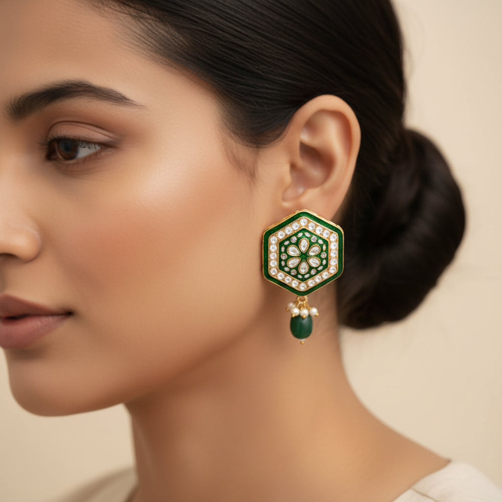 The Raelle Stone-Studded Hanging Bead Stud Earrings blend modern charm with classic detailing. Each piece features shimmering stones paired with delicate bead accents, adding subtle movement and sparkle to your look. Designed for comfort and secure wear, these earrings elevate both festive and everyday outfits with effortless sophistication. The rich colors give radiant touch that complements a wide range of styles and skin tones.