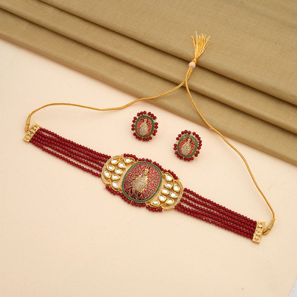 Tanira- Stone studded neckpiece set(Dark Red)