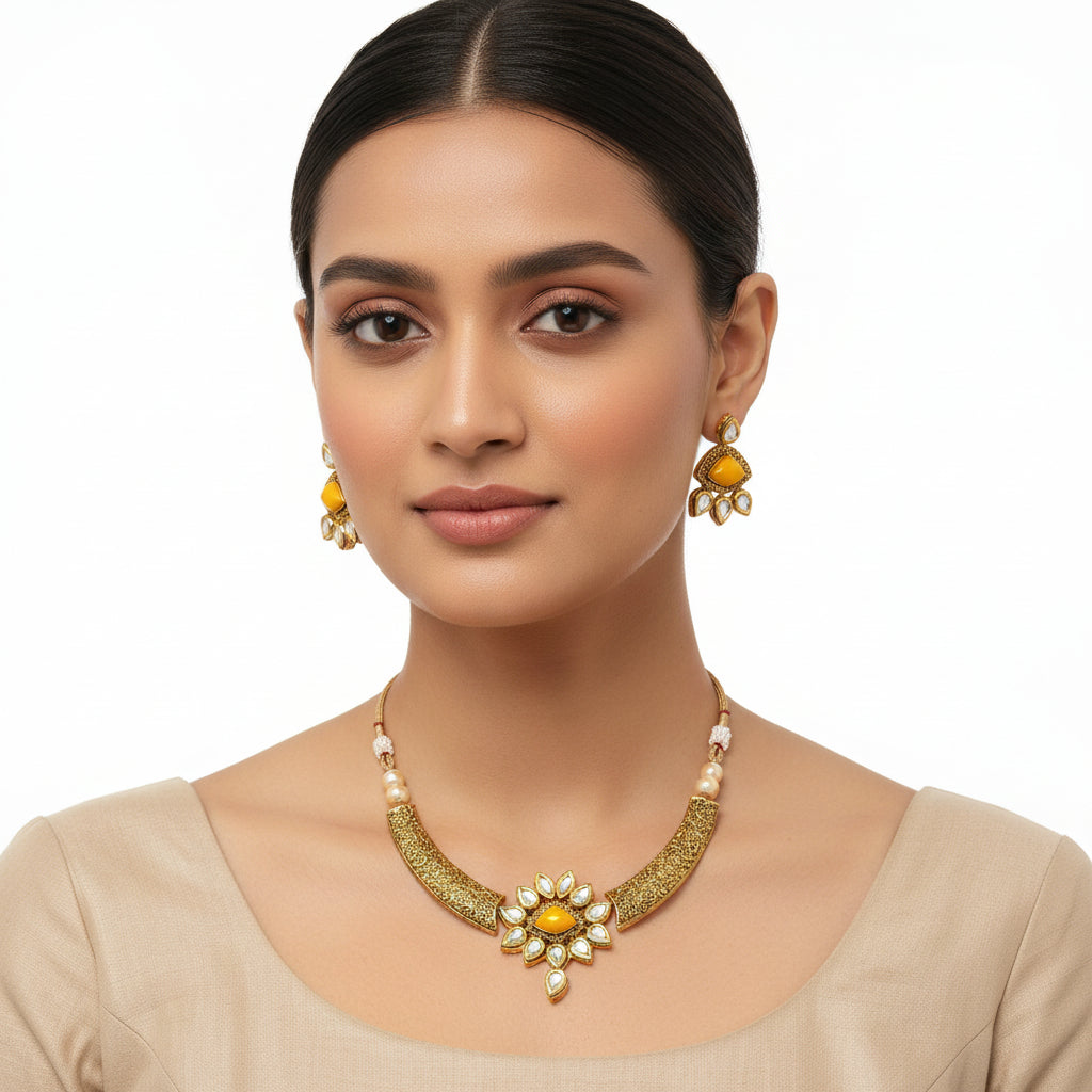 The Senira Neckpiece Set blends timeless elegance with modern charm. Featuring lustrous hanging pearls paired with intricately set stones, this piece creates graceful movement and refined sparkle. The yellow-toned design adds a vibrant touch, making it perfect for festive occasions, weddings, and elevated daily wear. Thoughtfully crafted for comfort and versatility, this set can be worn alone as a statement piece or layered for added impact.