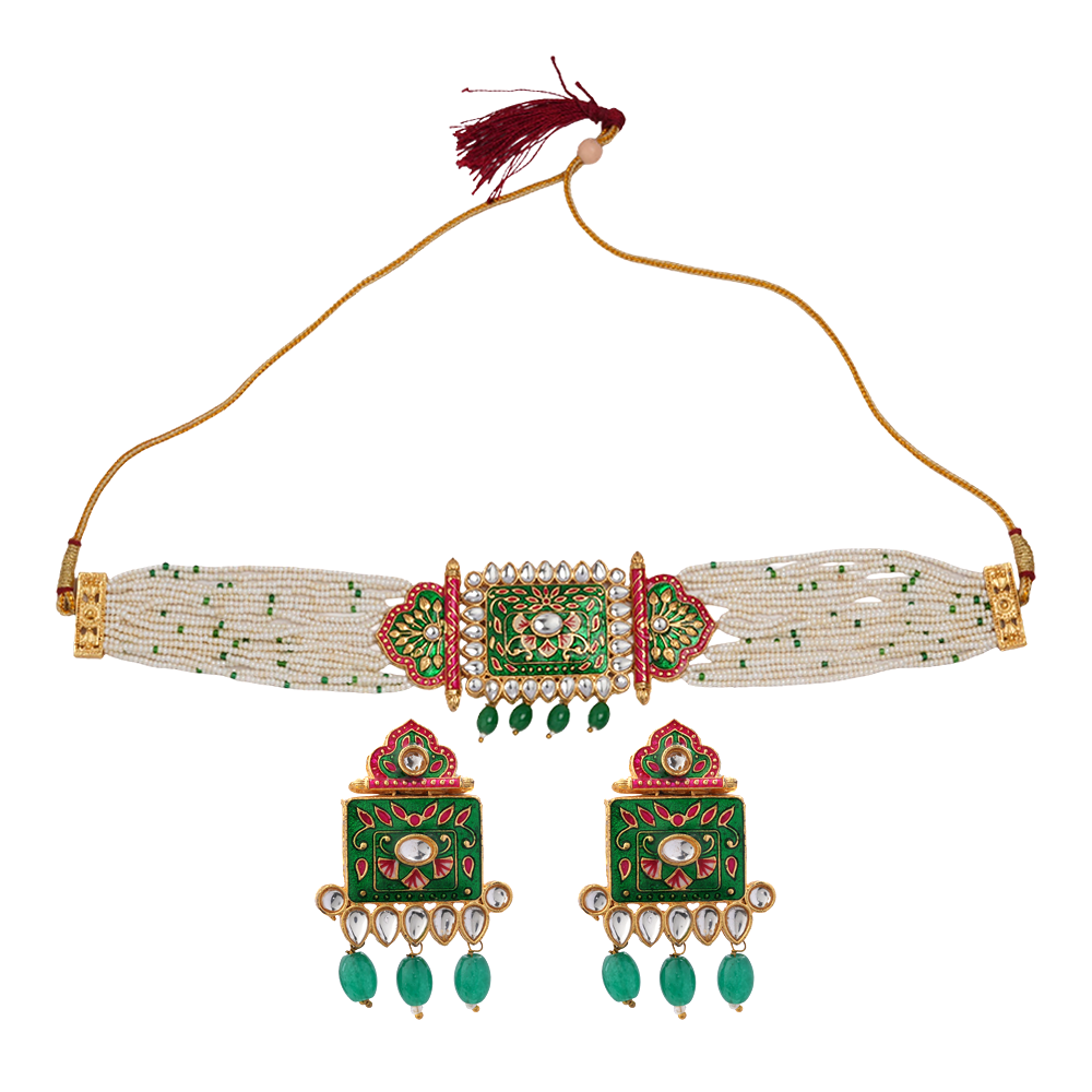 Ishani- Stone Studded Hanging Pearl Beaded Neckpiece Set (Green)