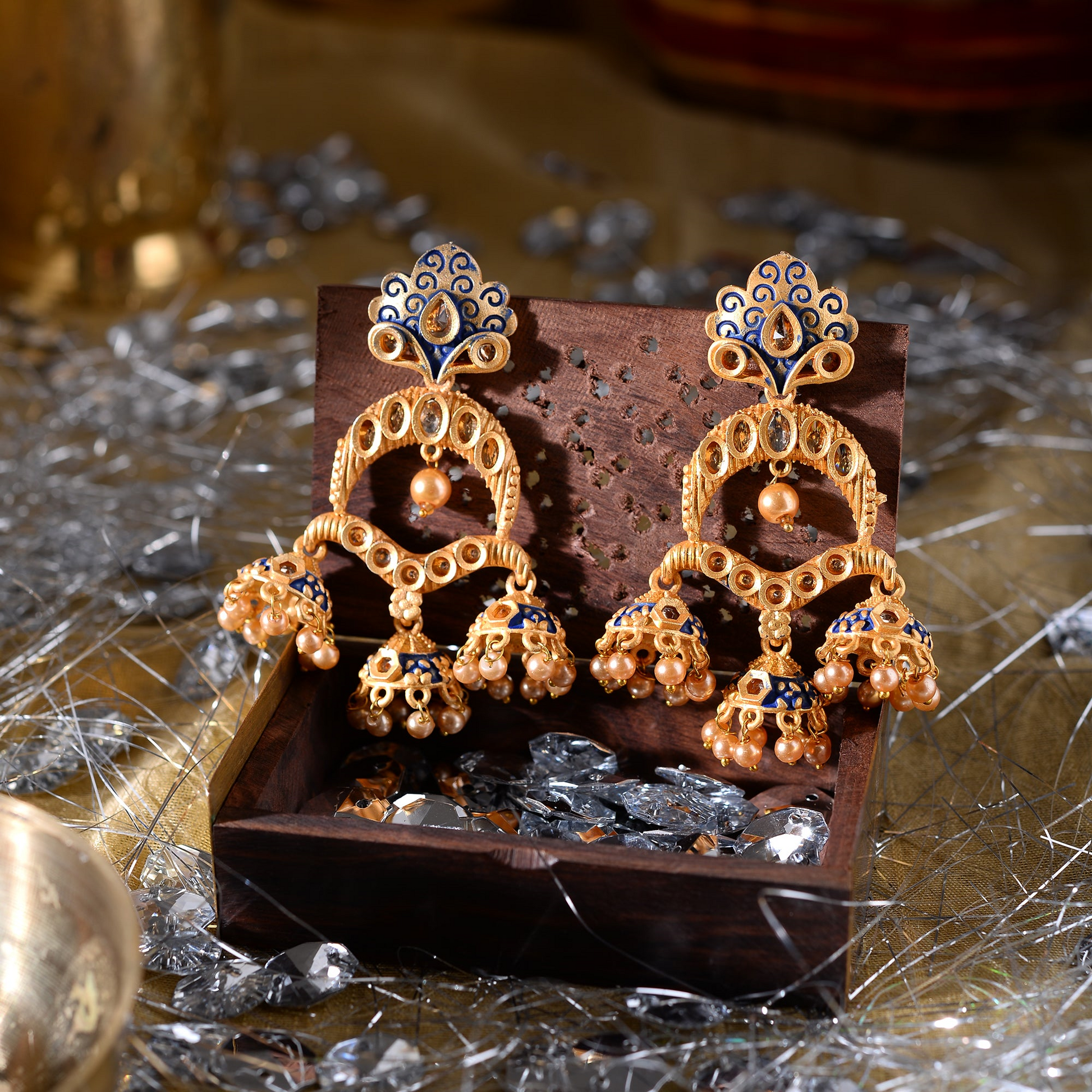 These Hamsika earrings feature exquisite blue stones delicately studded to enhance their elegant design. The hanging pearl danglers add a graceful movement, making them a perfect accessory for both formal occasions and sophisticated everyday wear. Crafted to combine timeless charm with contemporary style, they elevate any outfit with subtle shimmer and refined detail.
