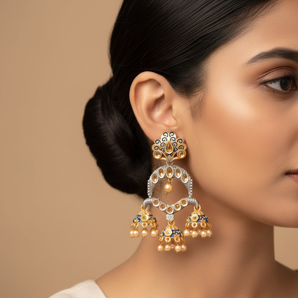 | Style Tip: Pair Hamsika with deep-toned ensembles—royal blue, wine, emerald or black. Opt for a bun or sleek ponytail to highlight the wide drop and pearl cascade. Skip heavy neck pieces—let the earrings be the hero. |