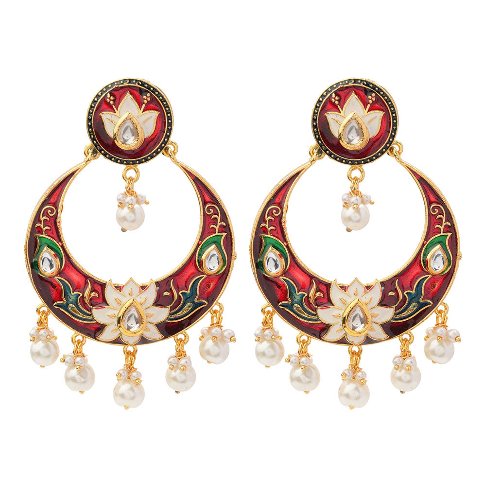 The Elina Pearl Dangler Earrings command attention with their dramatic silhouette and bold red detailing. Set on a golden base, shimmering stones cascade into a delicate row of pearls, creating beautiful movement and a rich, festive glow. Perfect for weddings, sangeet nights, or statement looks, Elina blends traditional Indian elegance with modern flair—designed to turn heads from the moment you walk in.
