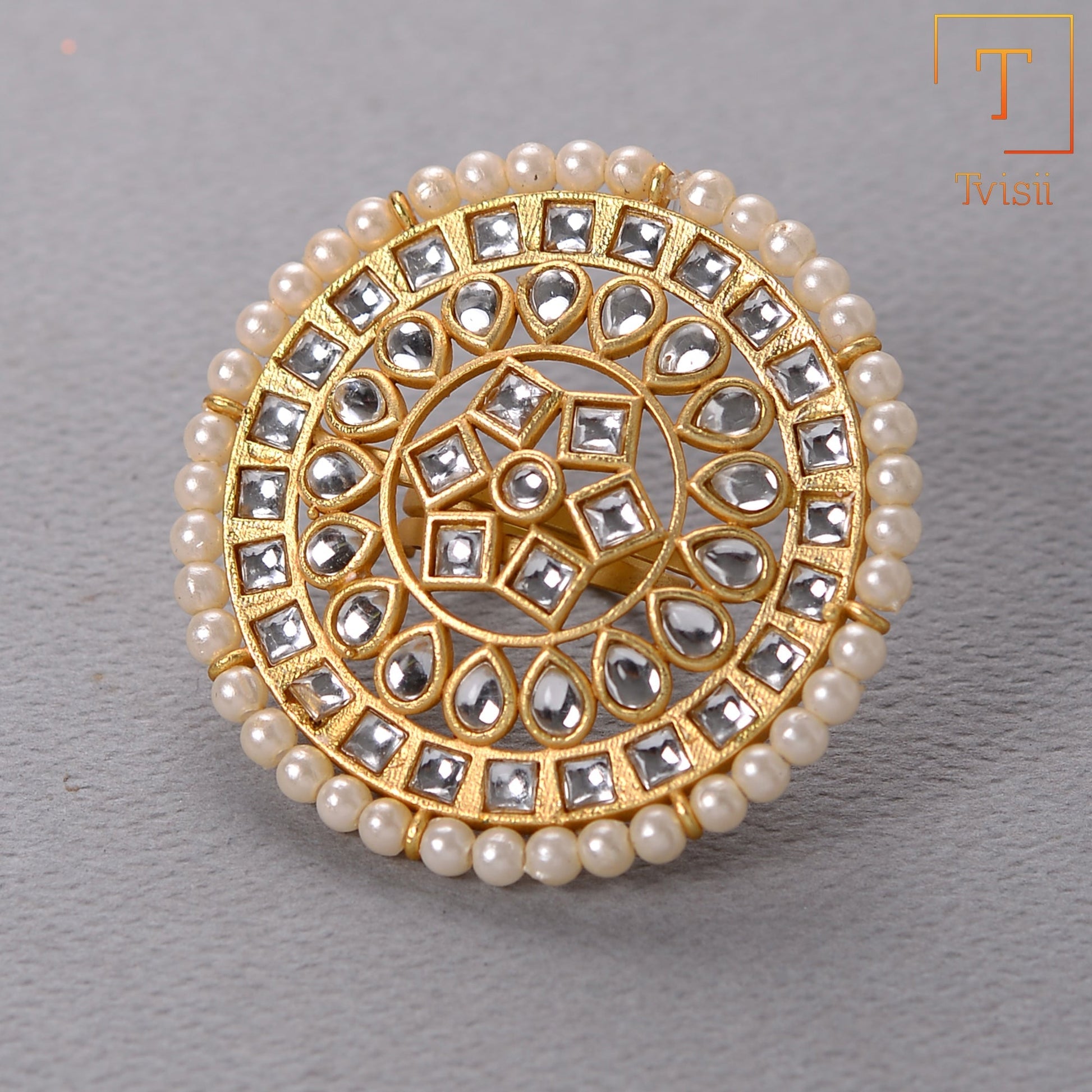 The Swara ring elegantly blends the timeless charm of kundan craftsmanship with delicate pearl accents. Designed for versatility, its adjustable band ensures a comfortable fit while making a refined statement. Ideal for both traditional and contemporary ensembles, this piece highlights expert artistry and attention to detail.