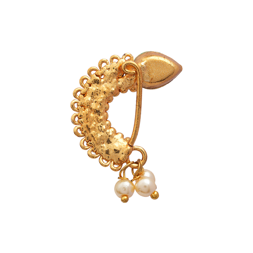 Elevate your ethnic charm with the Shruti Stone Studded Hanging Pearl Nath. Designed with sparkling stones and delicately suspended white pearls, this piece adds a subtle movement and refined elegance to your look. Lightweight and comfortable, it enhances festive and bridal ensembles without overpowering your natural features—perfect for occasions where grace speaks louder than glamour.