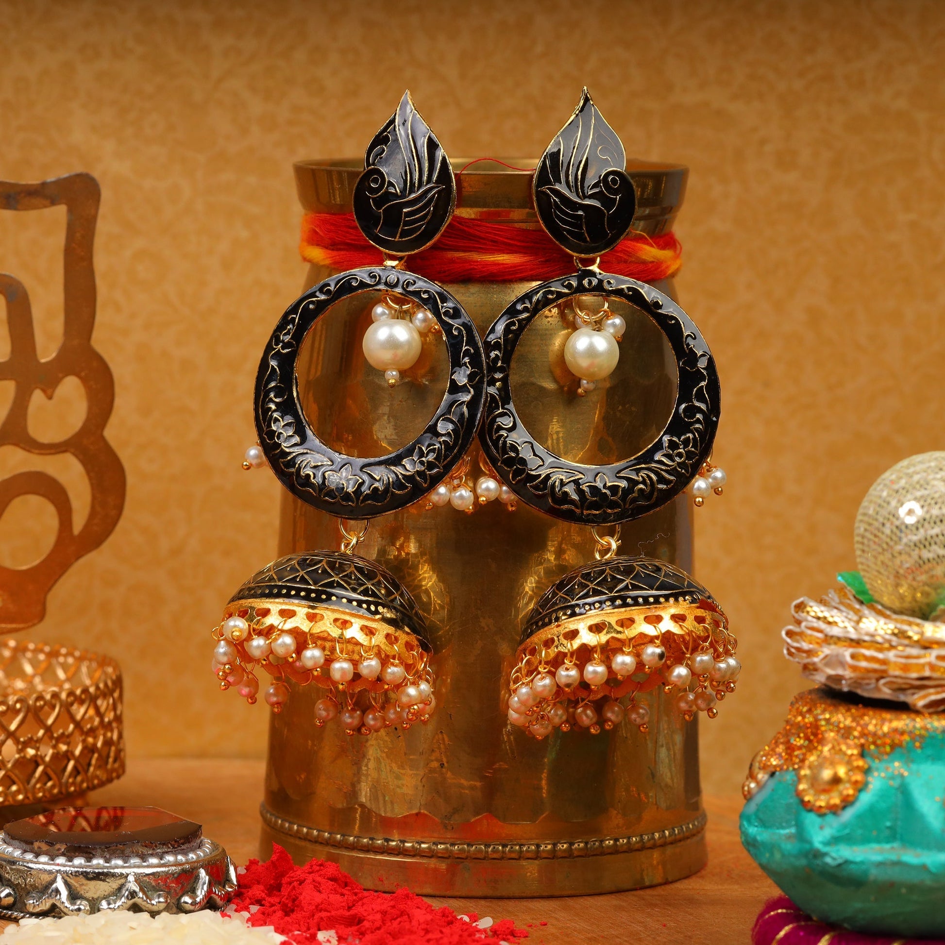 Elevate your traditional ensemble with the Heer Stone Studded Hanging Pearl Jhumka Earrings in Black. These intricately crafted earrings feature a meticulous arrangement of sparkling stones complemented by elegantly suspended pearls, offering a harmonious blend of classic charm and sophistication. Perfect for festive occasions or weddings, they add a refined touch of elegance and vibrant color to your look while ensuring comfortable, secure wear throughout the day.