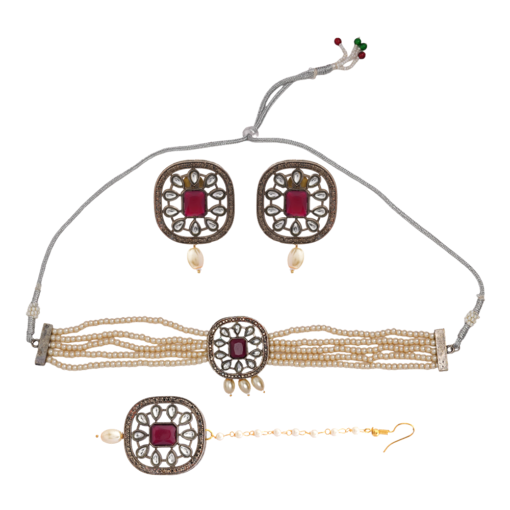 Elevate your look with the Jyotsna Stone Studded Hanging Pearl Beaded Neckpiece Set. Finely set stones and cascading pearls create a graceful silhouette, offering a subtle shimmer that complements festive and traditional outfits. Lightweight and crafted for comfortable wear, this set brings timeless elegance to any occasion.