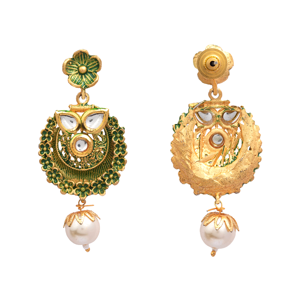 | Style Tip: Pair these danglers with a sleek bun or side-part waves and a hint of green in your outfit—let the pearls and stones brighten your face naturally. |