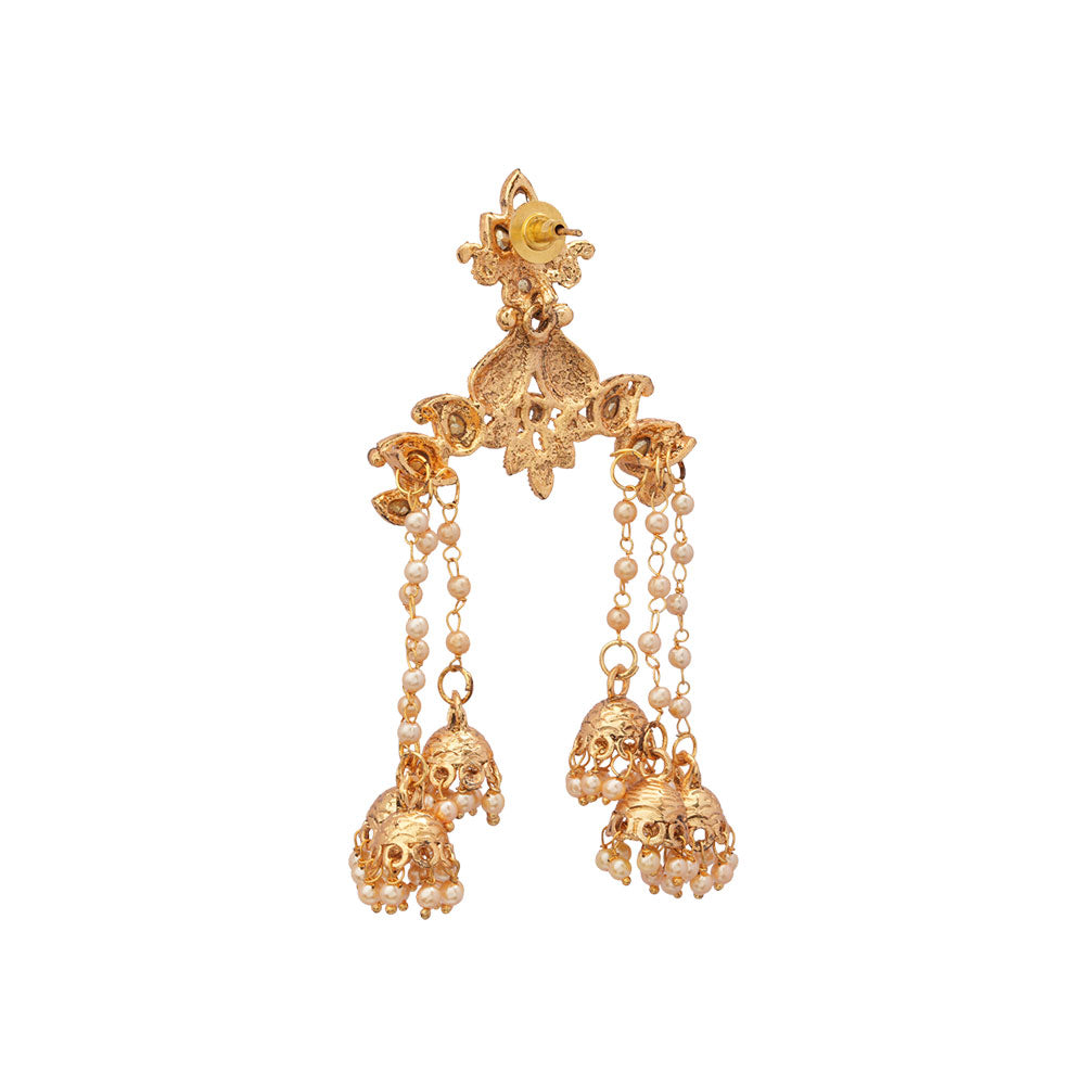 Designed to make an impression, the Ihita Dangler Earrings feature a sweeping golden frame accented with delicate stone clusters and soft pearl drops. Their elongated silhouette creates graceful movement and a luxurious glow, making them perfect for weddings, receptions, or statement festive looks. Bold yet refined, Ihita brings a touch of royal charm to traditional and contemporary ensembles alike.