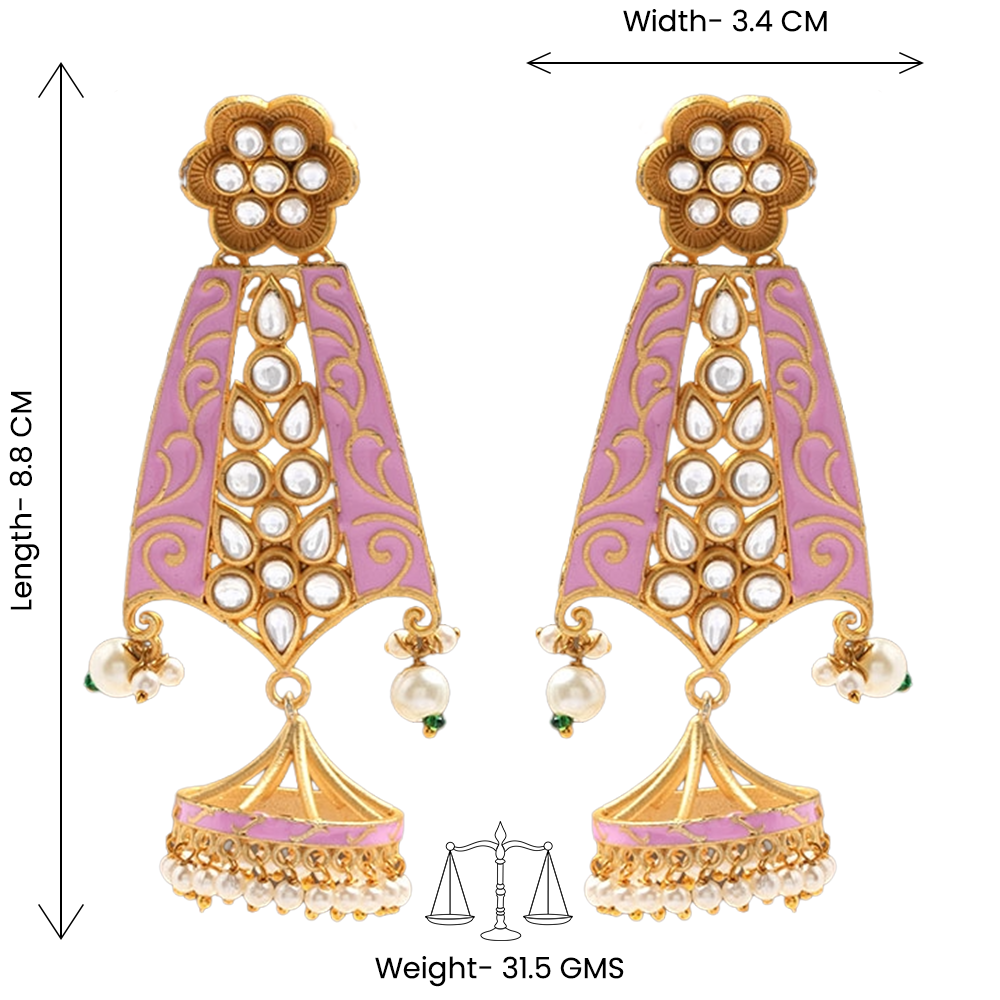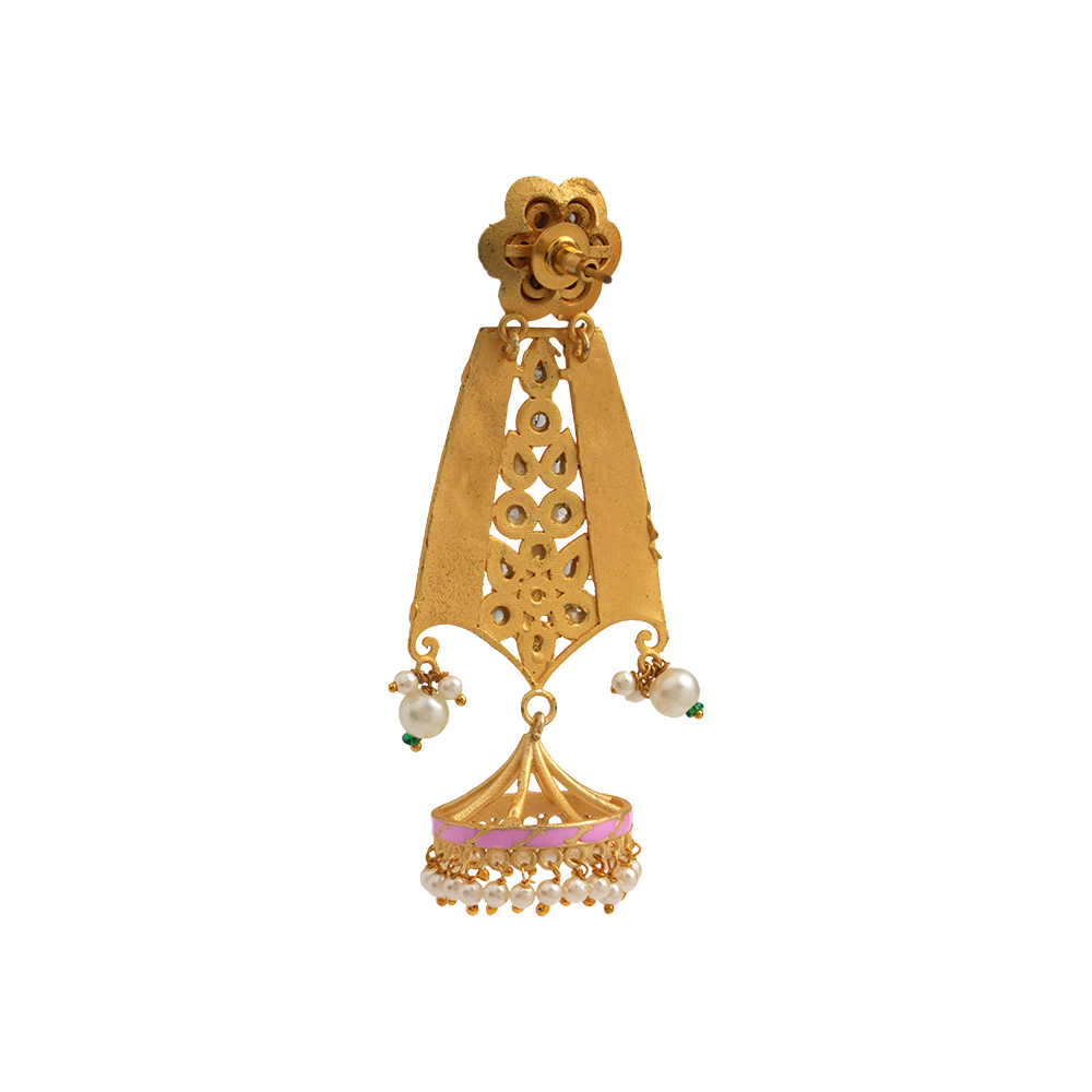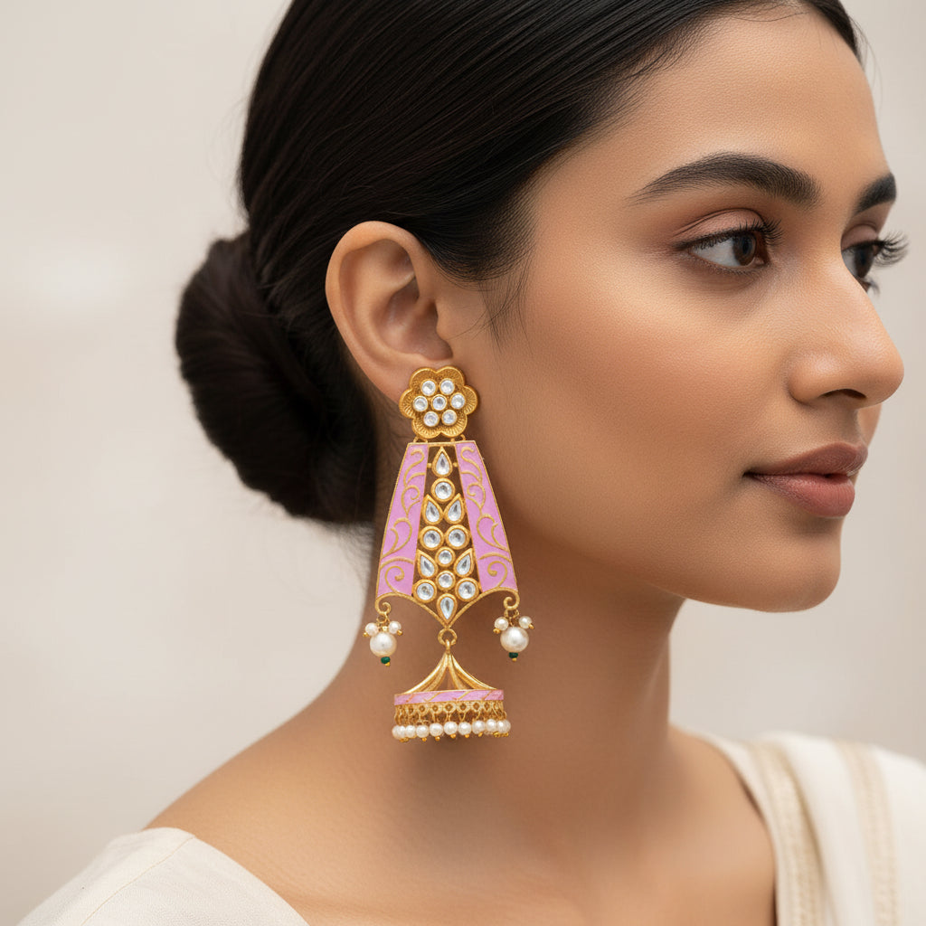 The Nirvi Stone-Studded Dangler Earrings blend delicate craftsmanship with contemporary elegance. Each earring features carefully set stones that catch the light beautifully, creating subtle sparkle with every movement. Designed in an elongated silhouette that adds definition to the face, the Nirvi earrings bring a statement presence to festive and formal occasions. The baby pink tone offers a soft, sophisticated touch that pairs effortlessly with both neutrals and jewel-toned outfits.