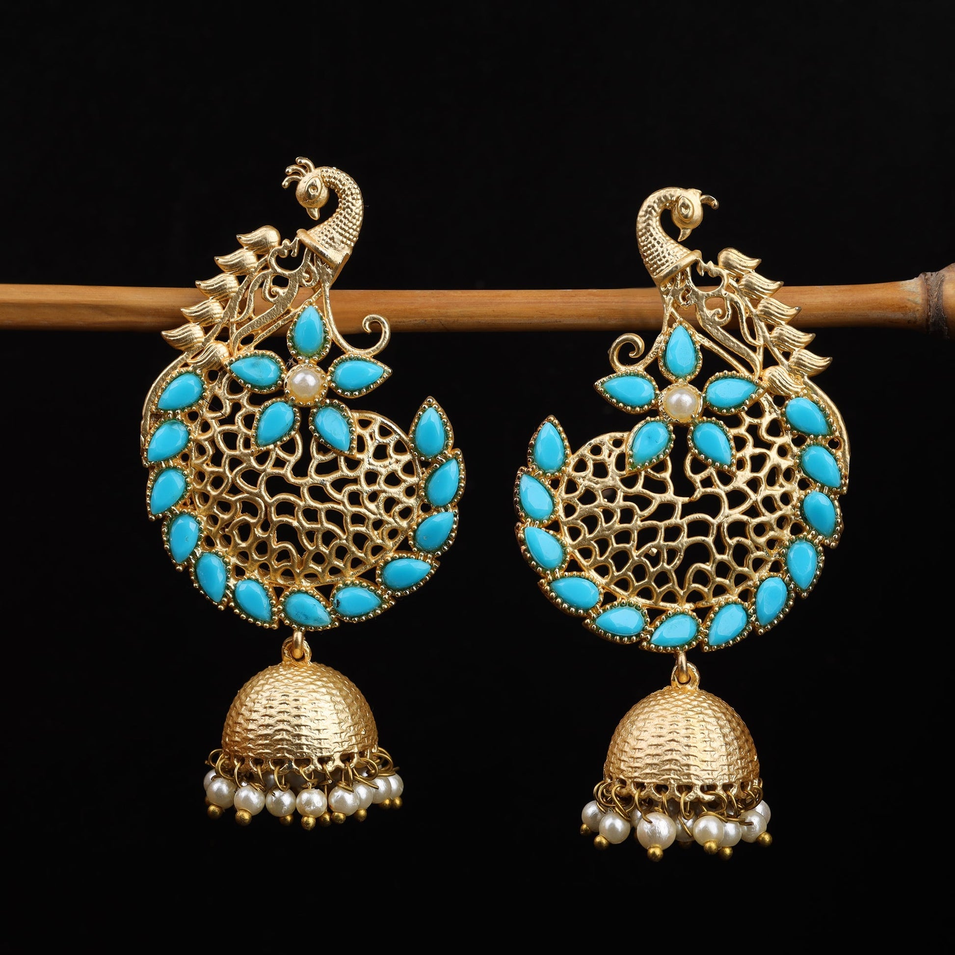 Elevate your traditional ensemble with the Prisha Stone Studded Hanging Pearl Jhumki Earrings in Sky Blue. Expertly crafted, these earrings feature meticulously set stones paired with delicate hanging pearls, creating a refined balance of sparkle and elegance. The deep red hue adds a rich, classic touch, making them ideal for festive occasions or weddings. Designed for comfort and lasting wear, these jhumkis enhance your look with timeless charm and intricate craftsmanship.