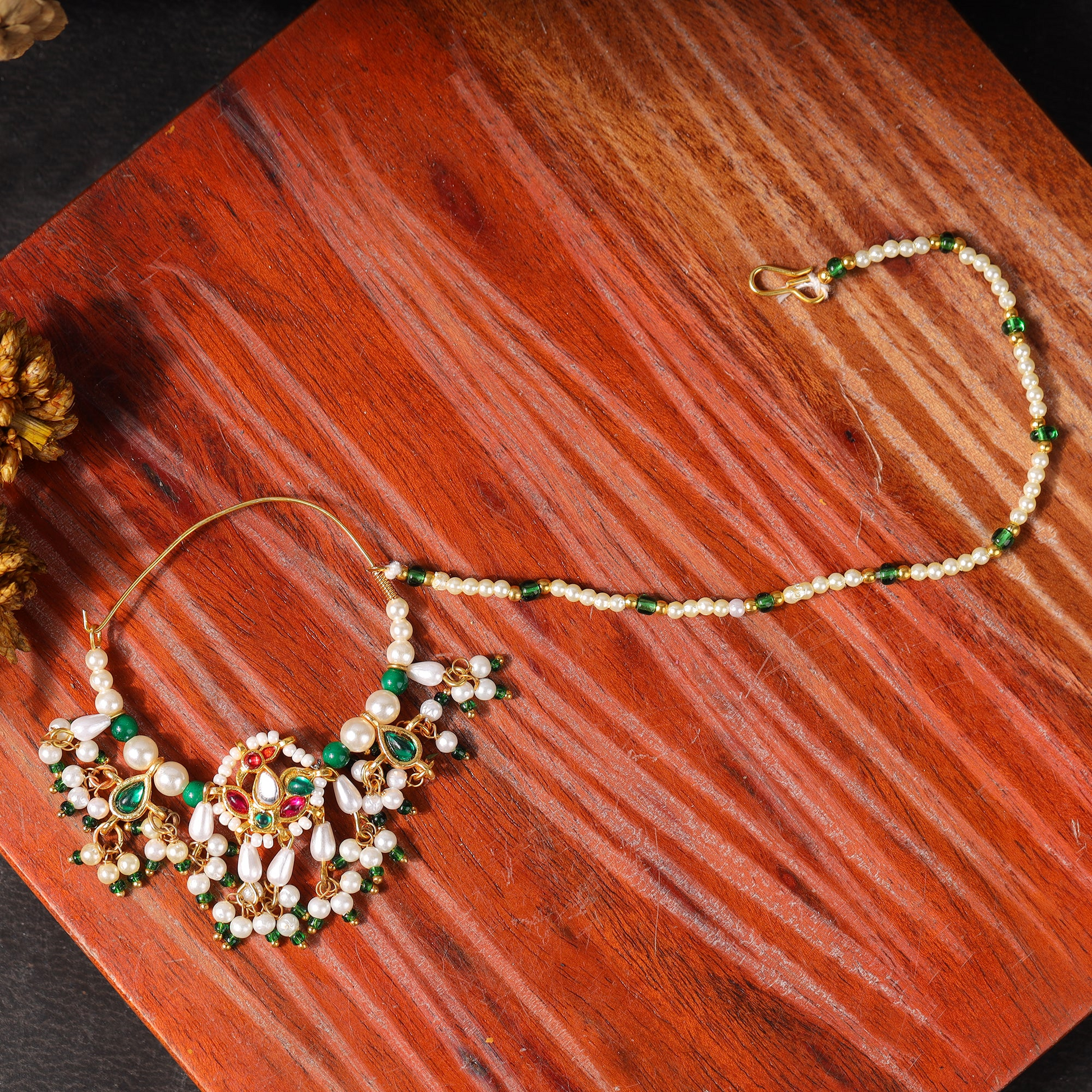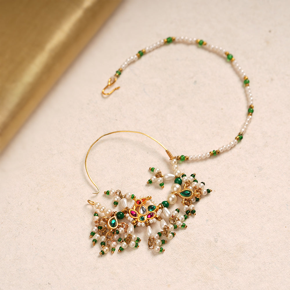 The Shobhita Hanging Baby Pearls Nath blends traditional elegance with delicate craftsmanship. Featuring finely suspended baby pearls, this nath accentuates facial contours while offering a lightweight and comfortable wear. Its intricate design enhances ethnic and bridal ensembles, making it a refined choice for special occasions seeking subtle sophistication and timeless charm.