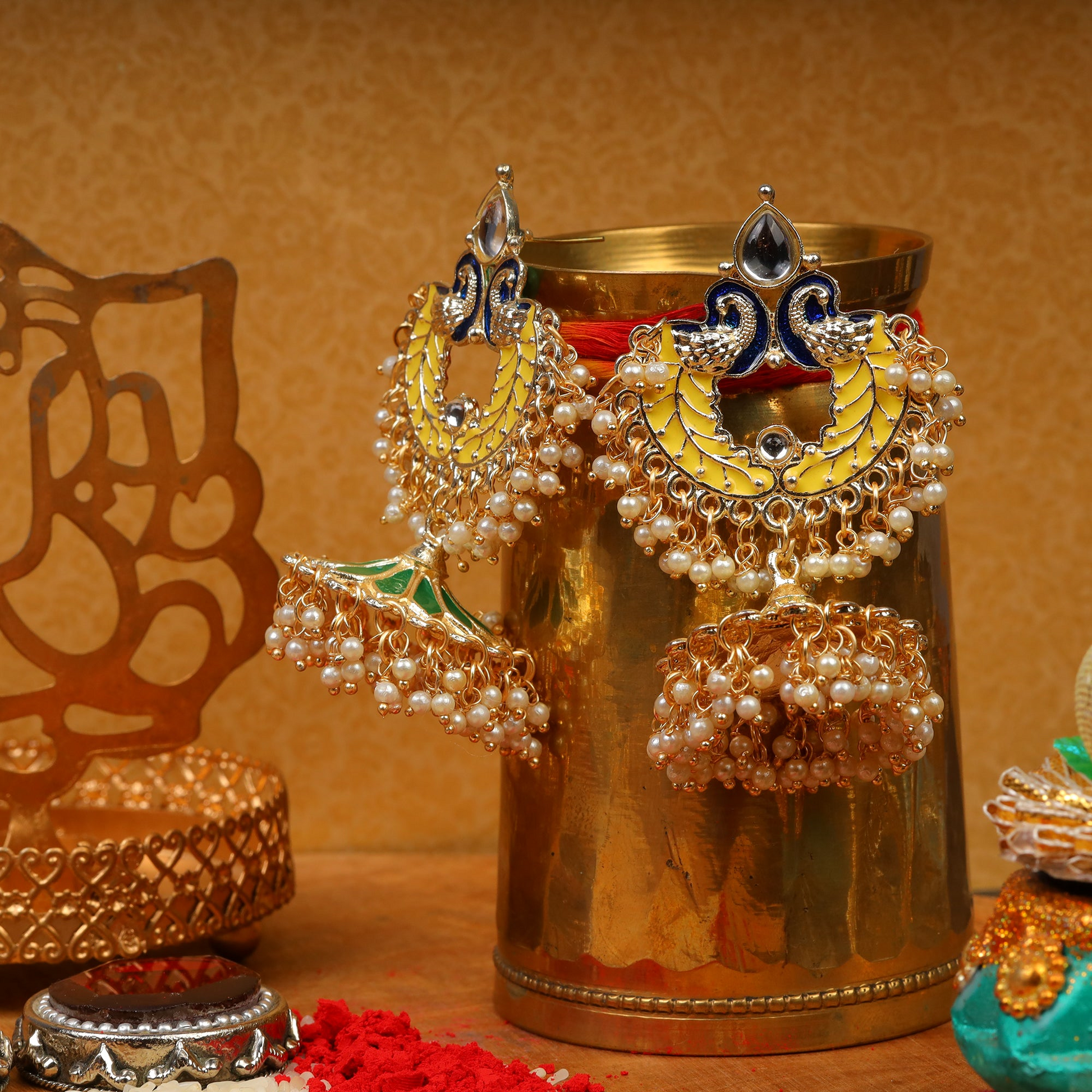 Elevate your style with the Hansini Stone Studded Hanging Pearl Dangler Earrings. Featuring multicolored stones delicately set to catch the light, these earrings are paired with elegant hanging pearls that add a touch of sophistication. Designed for both special occasions and everyday elegance, they offer a refined balance of sparkle and classic charm. Perfectly crafted to enhance your ensemble with expert finesse.